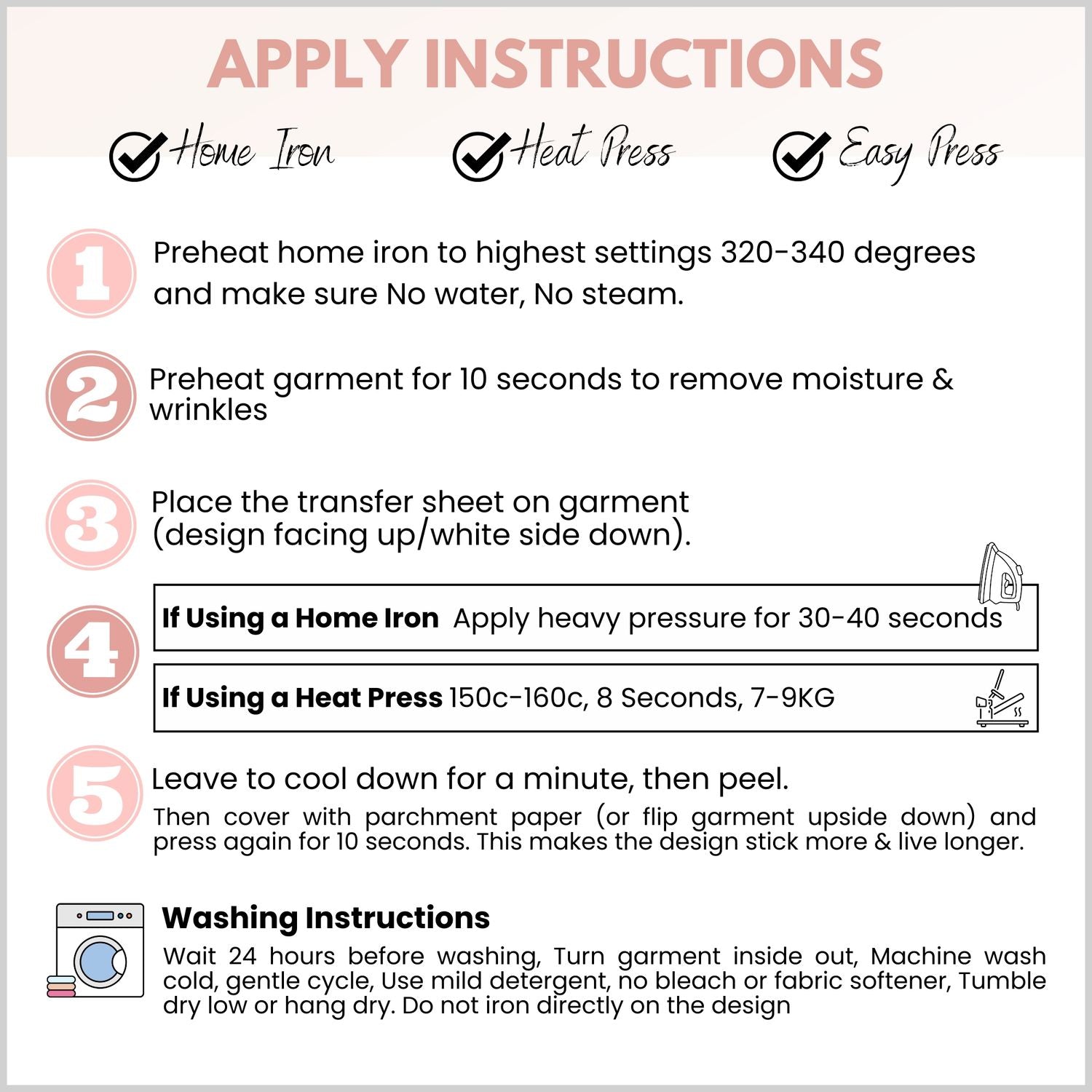 For best results, wait at least 24 hours after pressing transfers. Turn the garment inside out. Machine wash cold. Tumble dry on low heat. **Do not iron over transfer**