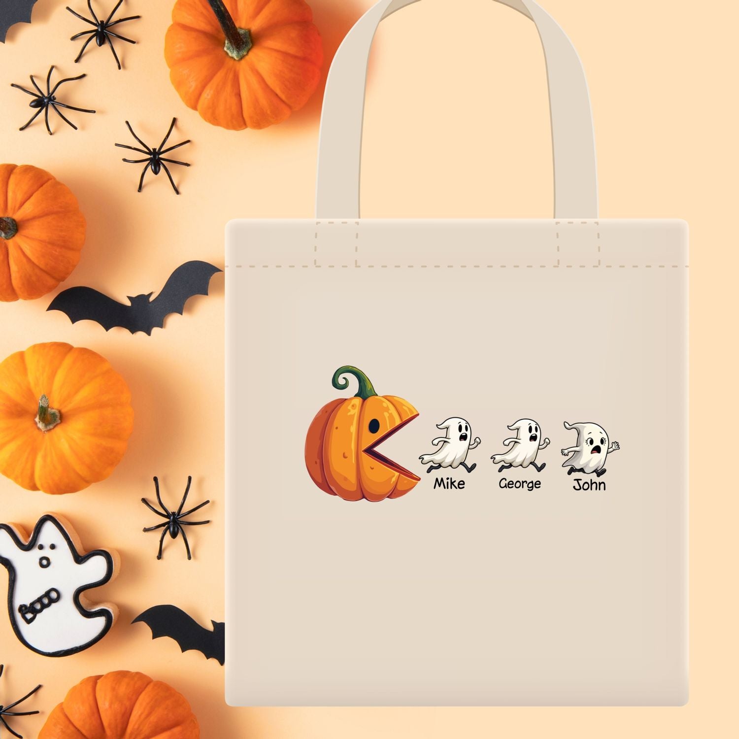 Fun Halloween personalized design featuring a pumpkin chasing cute little ghosts with personalized names! Perfect for matching family shirts or spooky season outfits.
