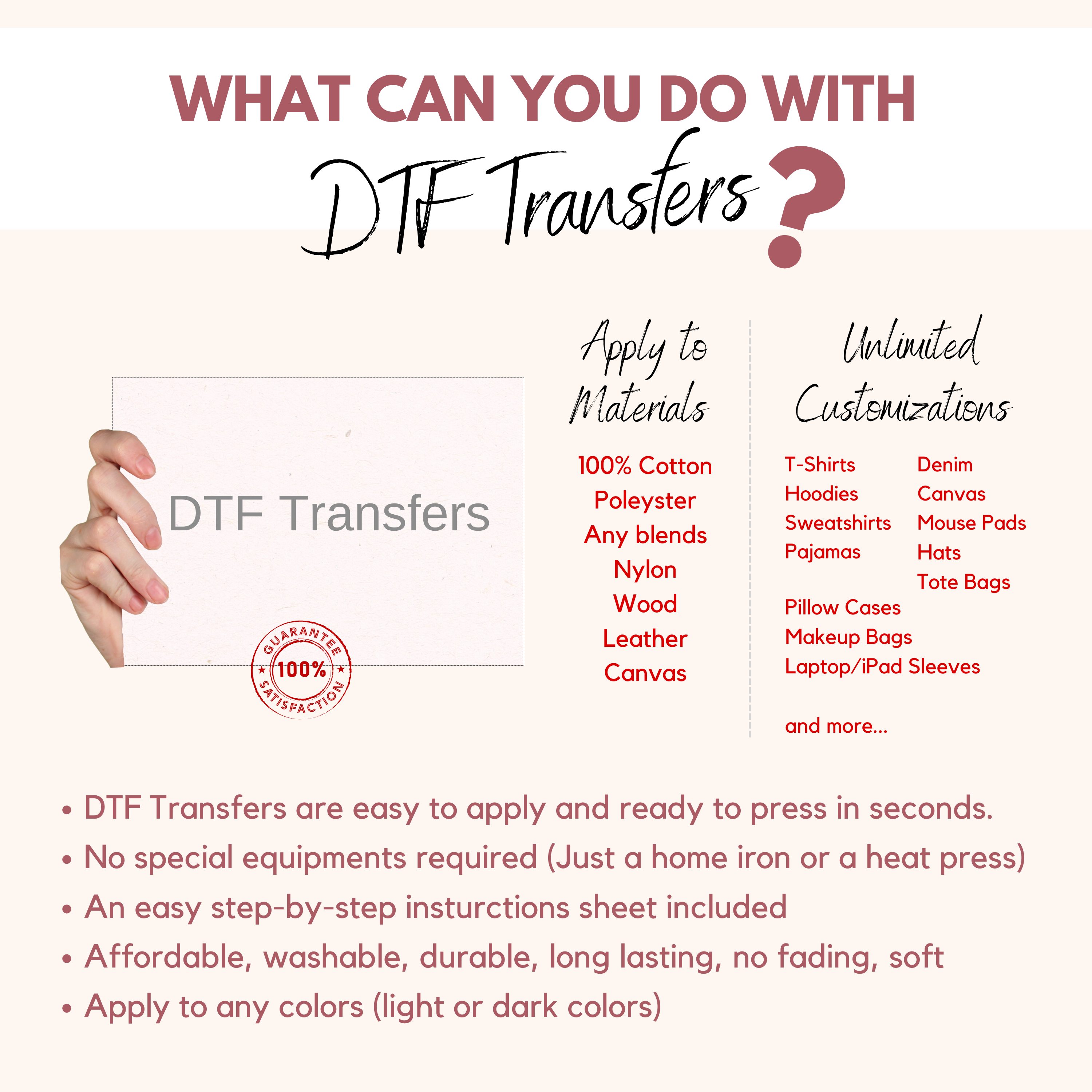 ✨ Application is a Breeze! Prepare: Ensure your garment is clean and wrinkle-free. Position: Lay out your DTF transfer where you'd like the design. Press: Use a heat press for optimal results, ensuring even heat and pressure distribution. Peel: Once cooled, peel away the film to reveal your fabulous design. 👕 Diverse Application: Whether you're jazzing up t-shirts, bags, hats, or any other apparel, our DTF transfers adhere seamlessly, giving a professional finish.