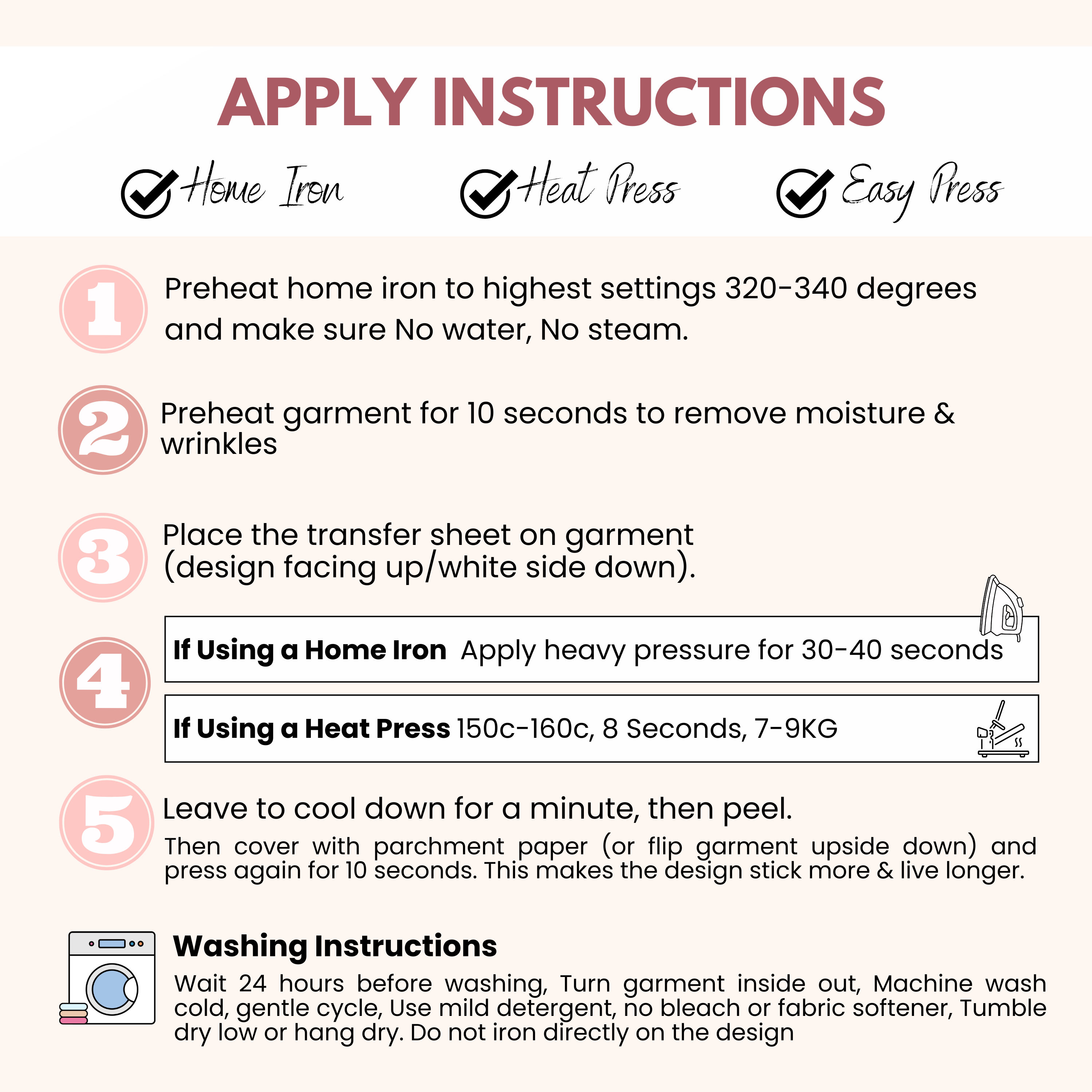 For best results, wait at least 24 hours after pressing transfers. Turn the garment inside out. Machine wash cold. Tumble dry on low heat. **Do not iron over transfer**