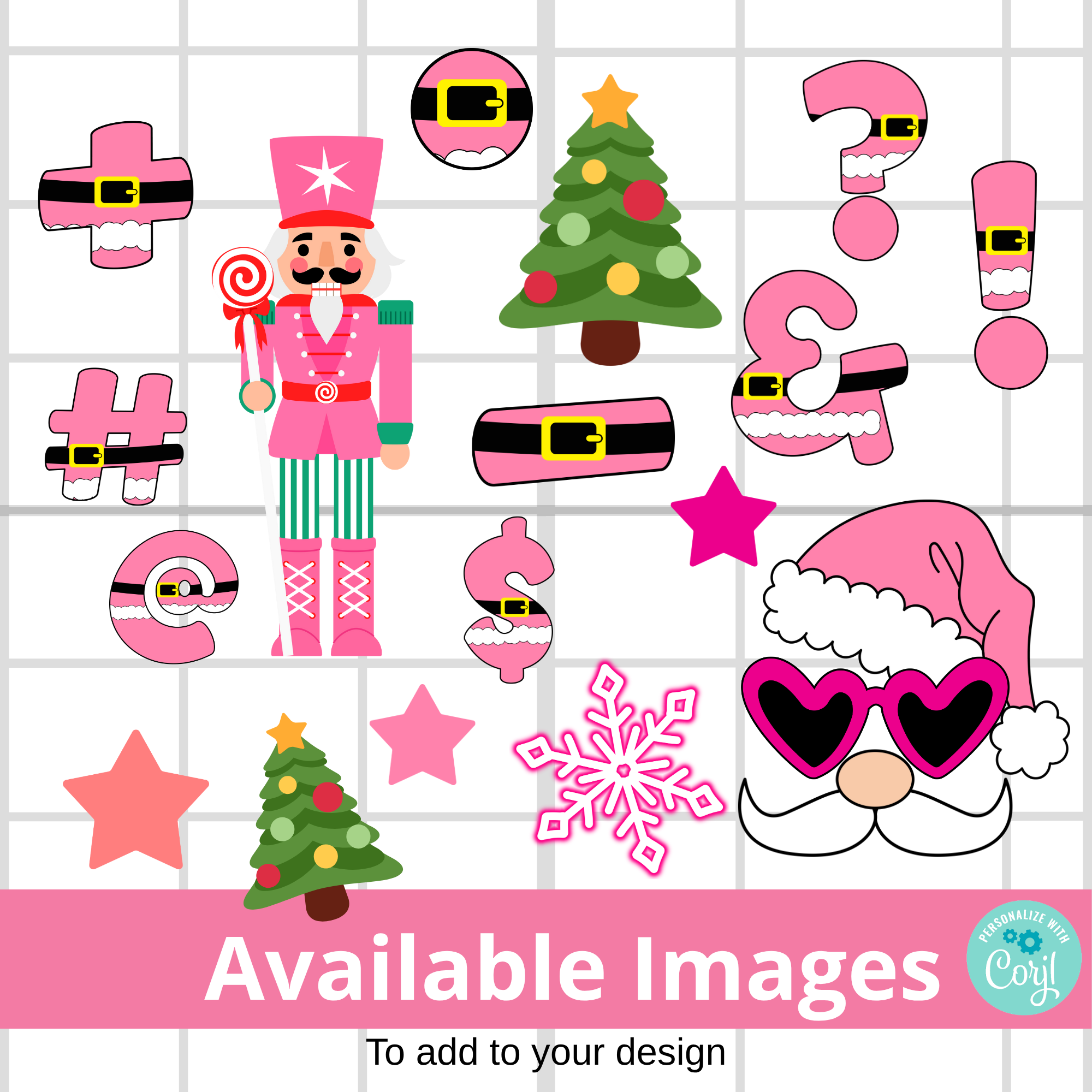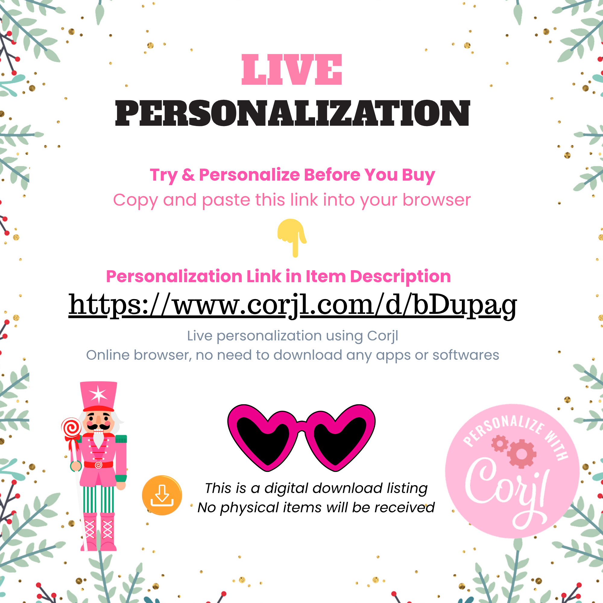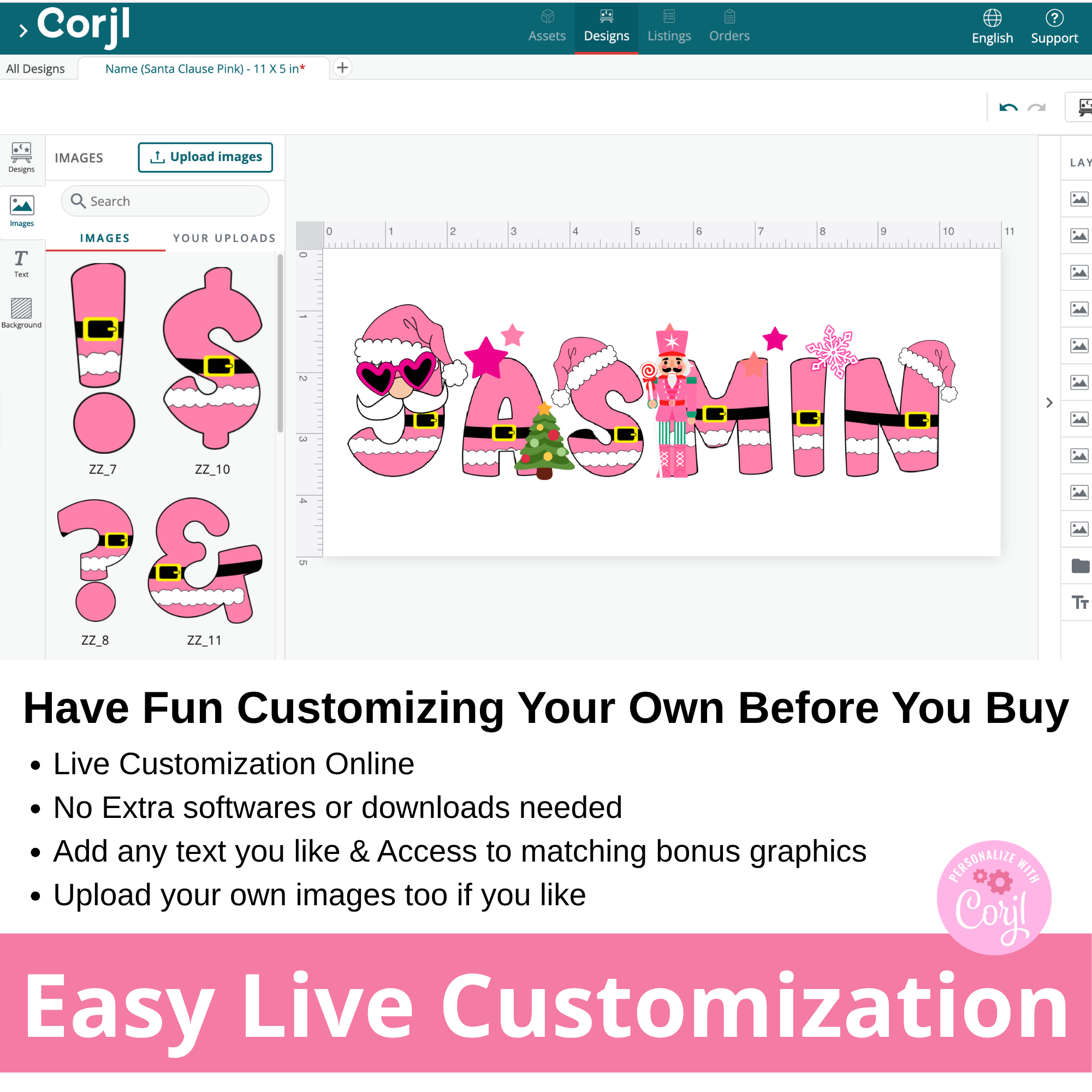 Celebrate Christmas with a fun, one-of-a-kind design! This digital download lets you create your own custom name right on Corjl before purchasing – no surprises, just the cutest personalized name, family name, or any word you like to design made just for you by you!